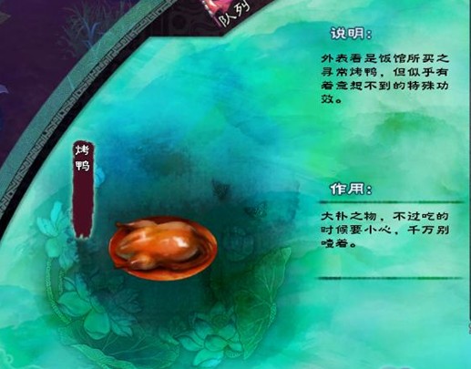 在仙剑奇侠传5中他关时会看到有很多烤鸭,看上去很可口,但不一直不太清楚这烤鸭有什么用处?到底应该怎么样处理,通过尝试之后终于了现了烤鸭的经典之处,鸭吃了后有几率加满血和发动10倍攻击、,我用云凡打出过2个1W+伤害‖。也可能被噎死(即死效果)