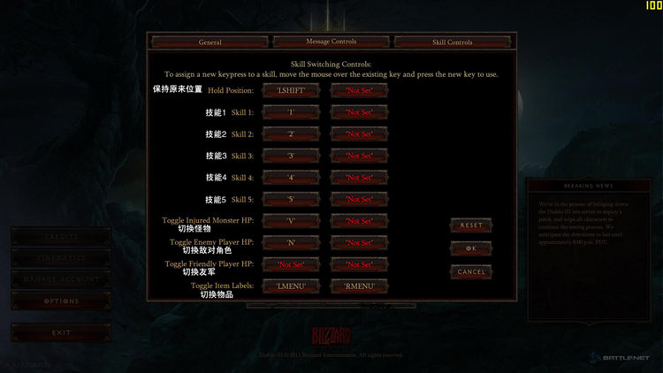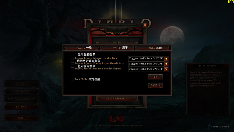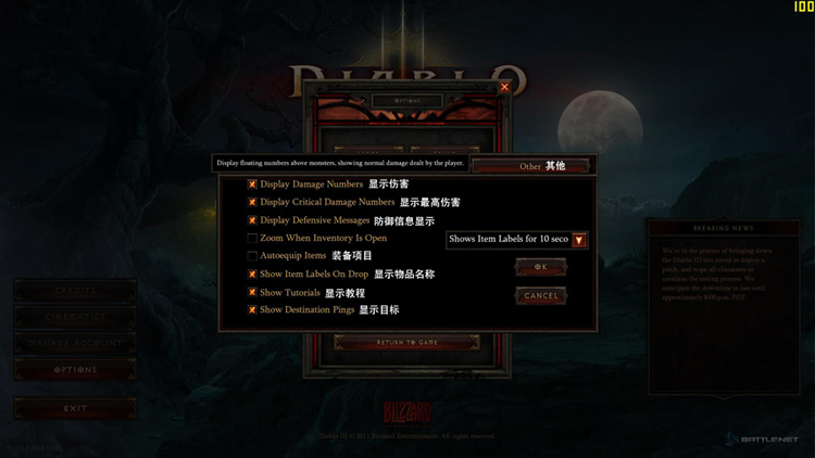 今天翻译了暗黑破坏神3的游戏菜单选项|,其中包括界面设置,画面选项翻译,音效音响选项翻译,战斗选项翻译,还有怪物选项翻译等