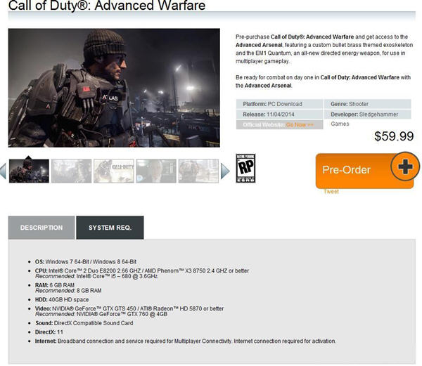 《使命召唤11》采用了全新的引擎〓,画面上较之前作有了全面的进化〓,因此相应的配置需求也不低,仅支持64位系统〓,40G的硬盘空间〓,而内存还是6G起步(不知道是不是跟10代一样,说是强制6G内存才能游戏,实际并不需要那么多)。